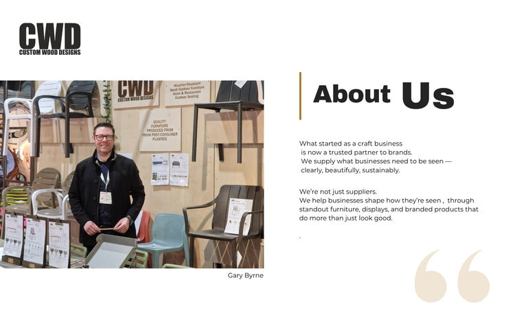 Founded in 2010, Custom Wood Designs started with a vision to transform how wood is used in everyday products. With over a decade of experience, we specialize in blending woodworking with branding, offering something truly distinctive for our clients in Ireland and abroad.