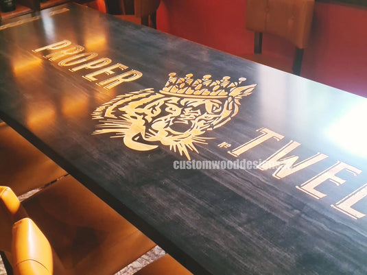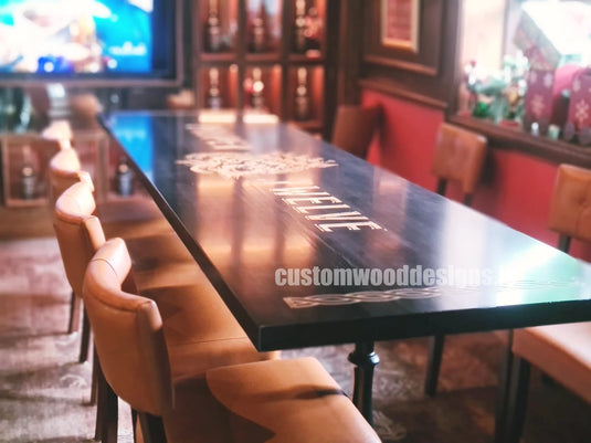 Branded tables and table tops in bars and pubs can contribute to a distinct and inviting ambiance. Custom Wood Designs can incorporate the bar's logo, drink specials, or decorative elements into the design, elevating the overall look and feel of the space. These branded tables can become a focal point, encouraging customers to gather around and enjoy their drinks while reinforcing the brand image.
