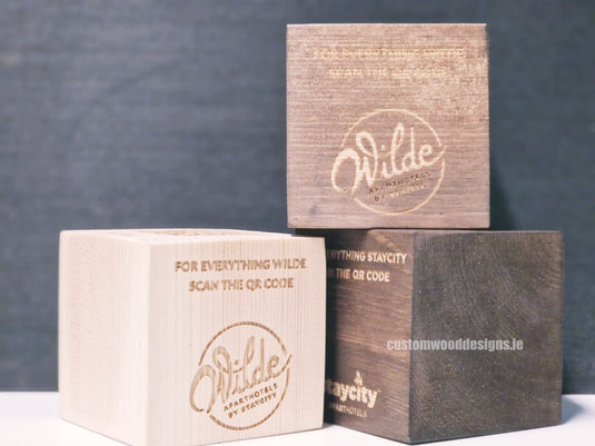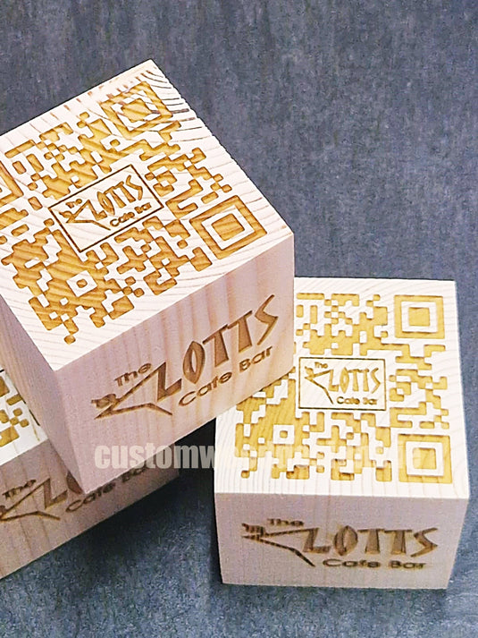 QR Codes on square blocks of wood crafted exclusively for Staycity. At Custom Wood Designs, we offer a unique combination of hand-made mass production, laser engraving on all four sides, and the option of stained or unstained natural wood finishes.
